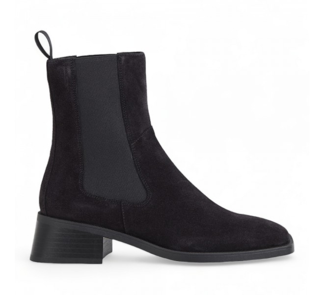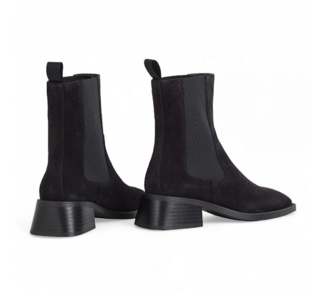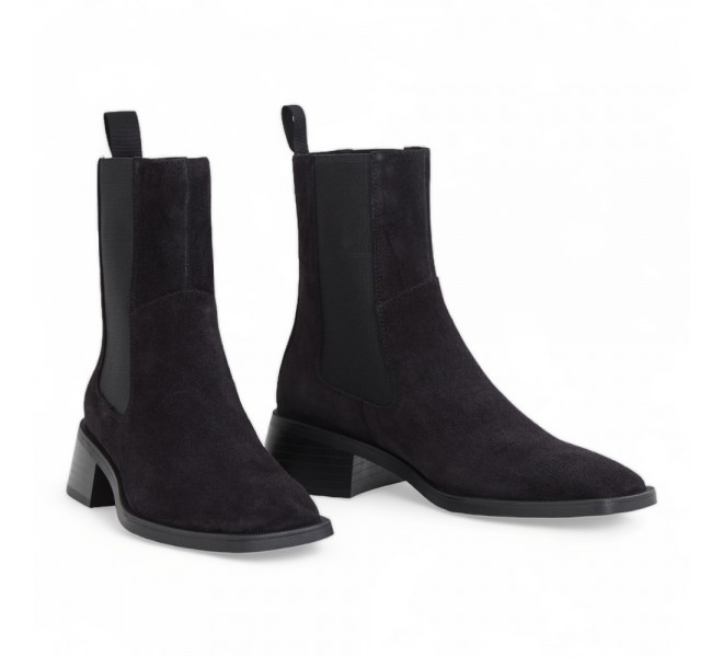 Blanca este o pereche modernă de cizme tip chelsea cu toc și o siluetă feminină. Model este confecționat din piele întoarsă de culoare neagră, cu vârfuri pătrate și înserții laterale elastice pentru a fi ușor de încalțat. Tălpile din cauciuc de înaltă calitate.